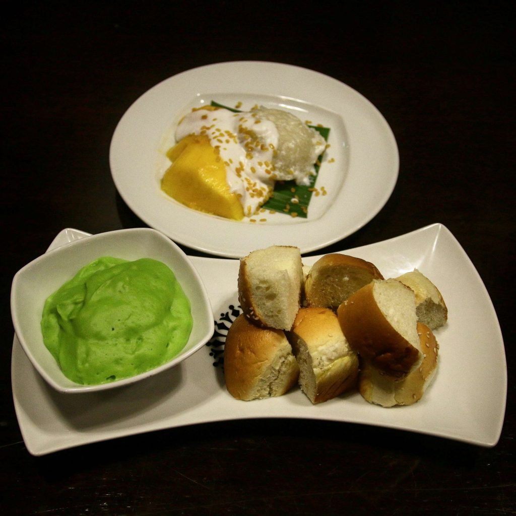 For dessert, we order Khao Niew Ma Muang (Mango Sticky Rice) and are also given the suggestion to try Sangkaya Bai Toey (Pandan Leaf Custard). Apparently, the latter is a common street food delicacy in Thailand. The sticky rice is good, with a mixture of sweetness and creaminess from the coconut milk and mango. The custard, however, is fantastic! It’s another visual draw with a bright green color, and has a silky texture with quite an unusual flavor. It’s not very sweet at all, and can best be described as comforting. It’s served with steamed bread, meant to be dipped in the custard, and the combination is just delightful.