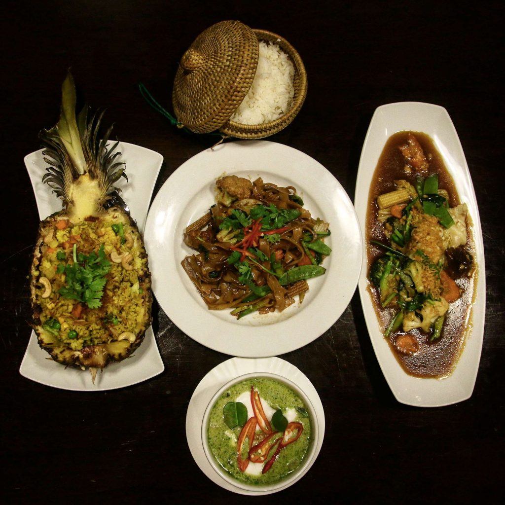 Our main courses consist of Gaeng Kiew Wan Reu Phed Phak Tao-Hoo (Thai Green Curry), Phad Phak Ruam (Wok Fried Mixed Vegetables), Khao Phad Sapparot (Pineapple Fried Rice) and Phad Se-ew Phak (Wok Fried Fat Noodles). We had ordered the red curry, expecting it to be spicier, but the manager was quick to point out that it’s actually a bit sweet, and the green curry is the spicy one. He’s certainly right about that; it’s got a lot of heat, but that’s balanced out by the creaminess of the coconut milk in it. The mixed vegetables are cooked with black mushroom and garlic, giving them a strong savory flavor. In contrast, the fat noodles aren’t quite as flavorful, and are also a bit dry. The pineapple rice wins in terms of visuals, as it’s presented in a half pineapple. It also has a very vibrant color thanks to the use of turmeric powder, and is pleasantly sweet.