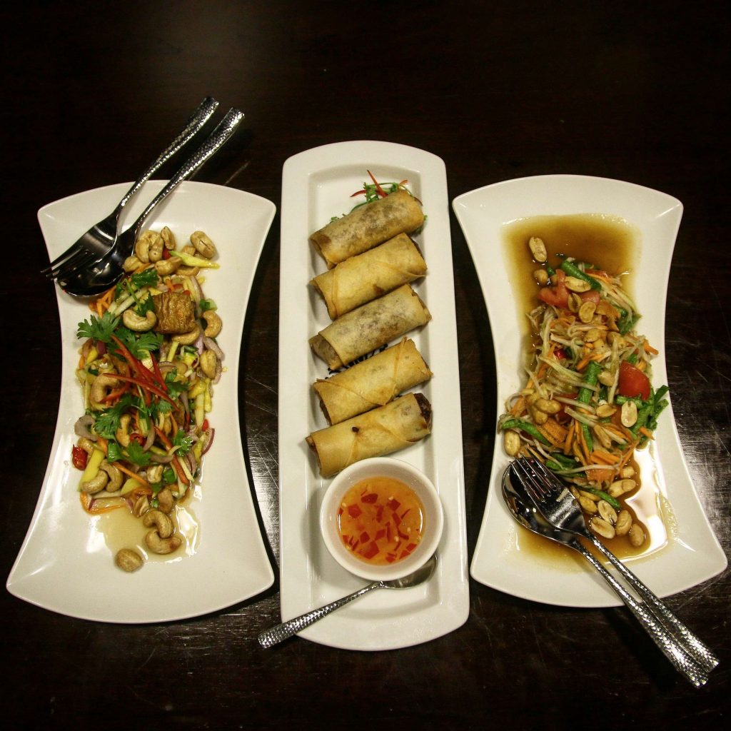 Curiosity sated, we order our starters: Poh Pia Thod (Vegetable Spring Rolls) and Som Tum Je (Raw Papaya Salad). It’s also strongly recommended that we try Yum Tao-Hoo Ma Muang (Raw Mango & Tofu Salad), which is one of their specialties, and we gladly add that to our order.