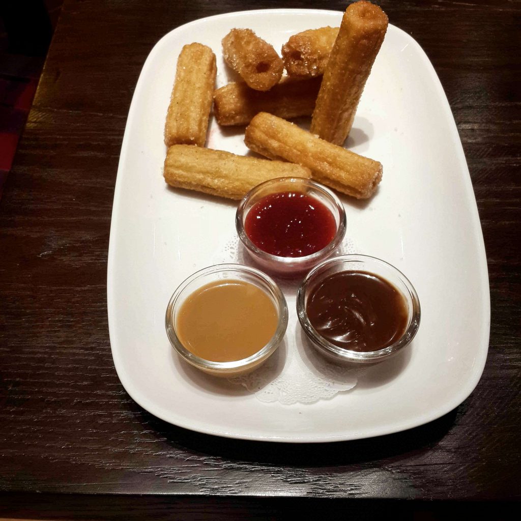 I’ve only had Tres Leches once before, at Maria Bonita in Jumeirah. I remember it being a wonderfully moist and almost creamy cake. This Tres Leches is comparatively dry, and the tartness from the blackberry sauce is a bit overpowering. I really would have liked the flavor of the cake to stand on its own. Perhaps it would be better to have the berries as an optional component rather than as a main element of the dish.