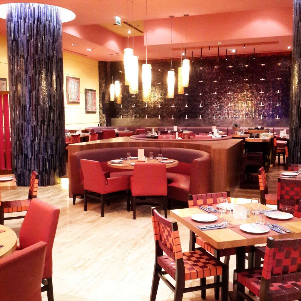 The interior certainly lives up to the name. ‘Rosa’ is Spanish for pink, and there are liberal splashes of the color in every aspect of the restaurant’s decor. It gives the space a warm and cheery vibe. There’s a waterfall running down the back wall covered in little figurines mimicking the mall’s famous ‘Angel Fountain’. Sombreros and ponchos lay strewn on a table on one side of the room, next to a desert backdrop. It’s a fun touch, letting diners play dress up and have their picture taken, but seems slightly at odds with the otherwise elegant look of the restaurant.