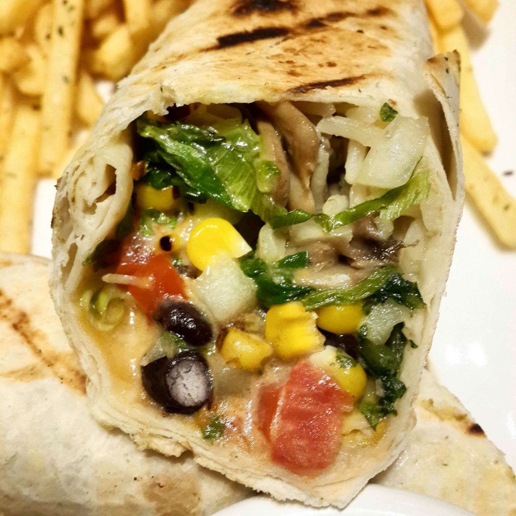For our main courses, we have the Burrito con Pollo (with veggies swapped in for chicken) and Vegetable Fajitas. There are a lot of similarities between both dishes, and the fajita essentially comes across as a deconstructed burrito. Both have a common filling of spinach, corn, mushrooms and onions. The only flavor distinction between them is that the burrito has black olives and tomatoes while the fajita has green bell peppers. Shredded cheese, sour cream and Mexican rice are other common elements between them. The fajita has additional accompaniments of guacamole and a refried bean puree, and the burrito comes with a side of highly addictive seasoned fries.