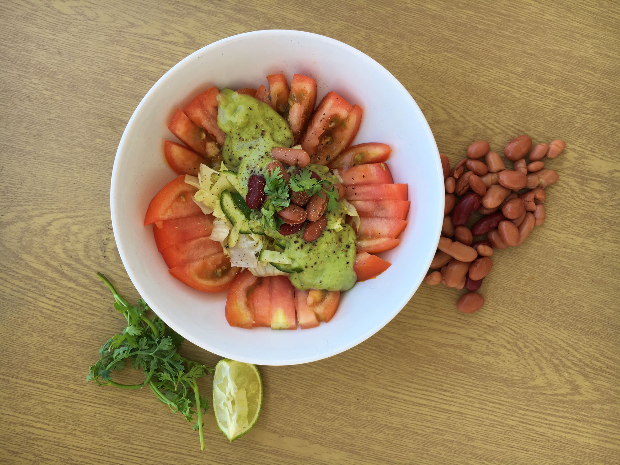 To a blender, add one large ripe avocado, one cup of chopped fresh cilantro (aka coriander), the juice from 3-4 small limes, 1/3 cup of extra virgin olive oil, 1/4 teaspoon of salt, 1/4 teaspoon cumin and 1 tablespoon of your choice of sweeter (I used maple syrup but feel free to sub in agave syrup or honey if not vegan) and blend. Add as much water as you need to thin it out and add more coriander, lime juice or salt to taste.