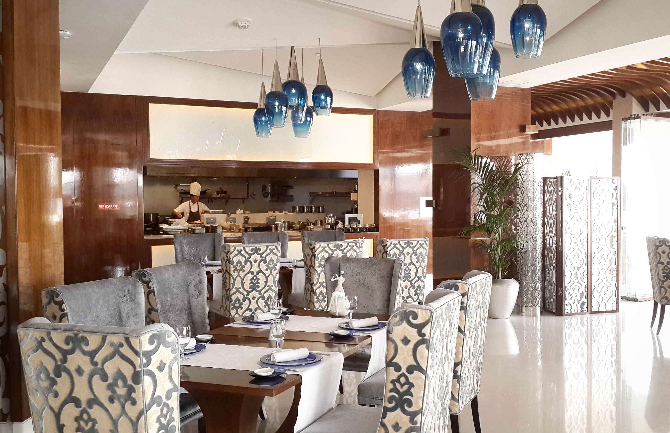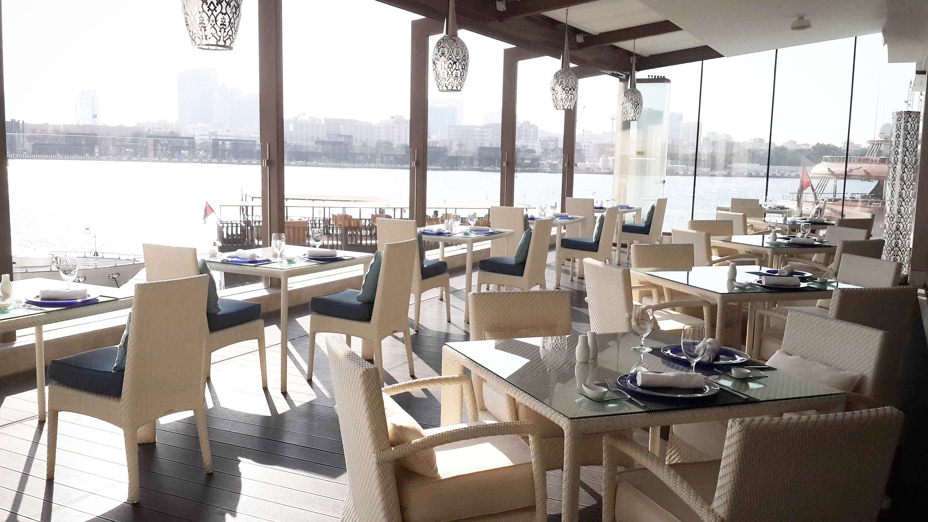 The restaurant is more spacious than I’d thought, and takes up a crescent-shaped space that overlooks a beautiful view of the creek and the Dubai skyline. The interiors are bathed in cool whites and grays with touches of blue, and there’s terrace seating available as well, but I opt to sit indoors.