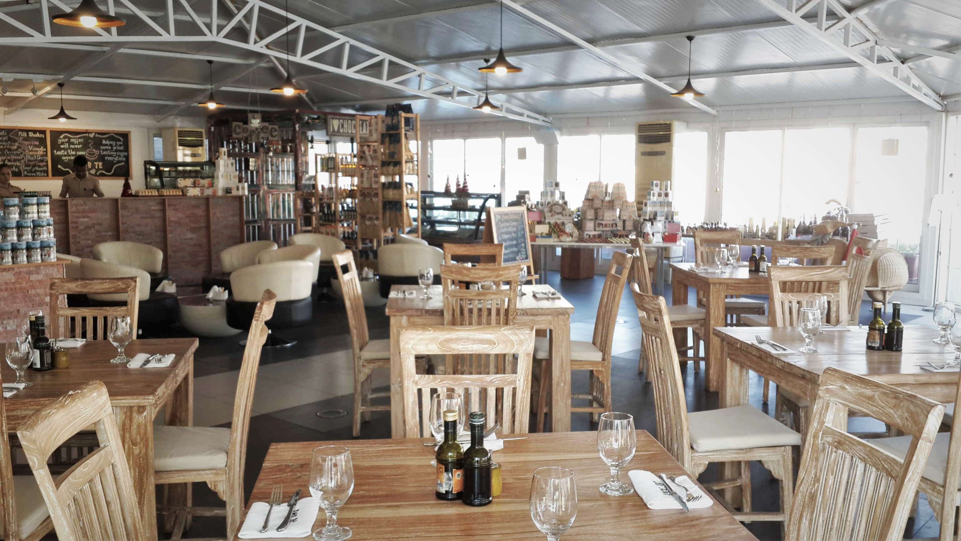 On entering the restaurant, I discover it’s much more spacious than it seems, with four main dining areas: two on the ground floor, one on the first floor, and a terrace. The main dining room has a slightly rustic look with wooden seating and large windows, but is also a bit cluttered, sharing space with a café, open pizza kitchen and retail area. It’s an odd mix, like a casual eatery that’s masquerading as a fine dining restaurant without a license to serve wine.